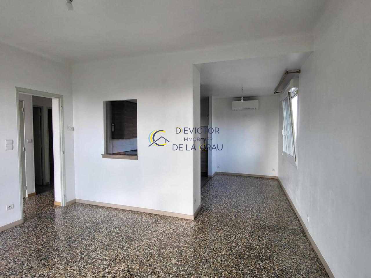 deux chambres, un séjour avec coin-cuisine aménagé et équipé (plaques + four), une salle d'eau, un wc, un balcon et une buanderie. une place de parking privative. Logement climatisé.